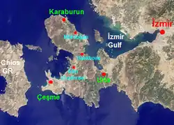 La péninsule est située entre le golfe d'İzmir, à l'est, et le détroit de Chios, à l'ouest. Elle est une grande excroissance de la péninsule d'Urla vers le nord. Son point culminant est l'Akdağ (1218 m).