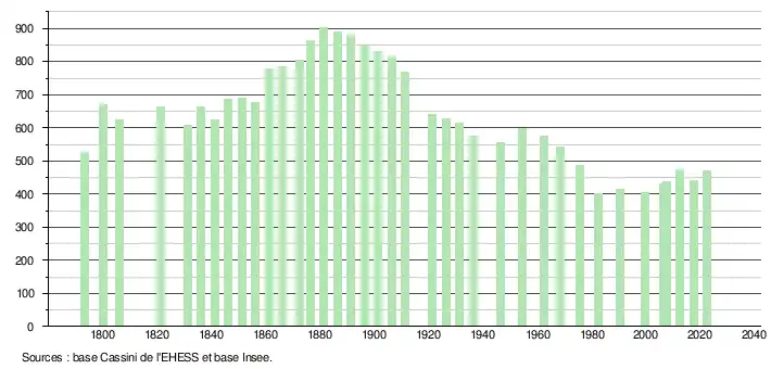 L'évolution du nombre d'habitants est connue à travers les recensements de la population effectués dans la commune depuis 1793. Pour les communes de moins de 10 000 habitants, une enquête de recensement portant sur toute la population est réalisée tous les cinq ans, les populations de référence des années intermédiaires étant quant à elles estimées par interpolation ou extrapolation[24]. Pour la commune, le premier recensement exhaustif entrant dans le cadre du nouveau dispositif a été réalisé en 2007[25].
