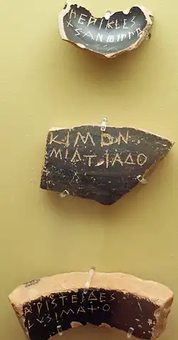 On l'attribue traditionnellement à Clisthène, mais le premier vote d'ostracisme n'eut lieu qu'en 488 av. J.-C., si l'on en croit Aristote[2]. Après les expulsions en masse qui eurent lieu au VIe siècle av. J.-C., et qui frappaient collectivement des genè, des familles entières, on décida de proscrire seulement les tyrans et leurs fils[3], en prévenant les autres membres des Pisistratides que s'ils venaient à troubler l'ordre public, ils seraient expulsés pour dix ans. Ils se tinrent éloignés de la vie publique longtemps.
