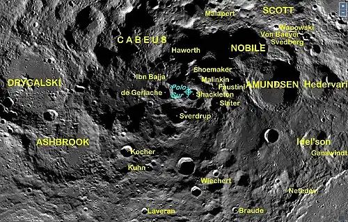 L'axe de rotation de la Lune se trouve dans le cratère Shackleton. Les cratères notables les plus proches du pôle sud lunaire comprennent De Gerlache, Sverdrup, Shoemaker, Faustini, Haworth, Nobile et Cabeus.