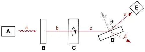 - La source infrarouge (A) émet un faisceau monochromatique (a) vers le polariseur (B) qui sélectionne un plan de polarisation en éliminant tous les autres ;