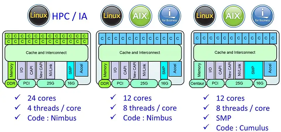 - ↑ (en) Timothy Prickett Morgan, « Power9 To The People », The Next Platform, : « the Nimbus Power9 chip used in the AC922 is a single chip module that has 24 cores on the die. The Summit and Sierra machines based on the AC922 are getting 22 core versions of the chips ... IBM could later, as Power9 yields improve, add a 24 core option. »