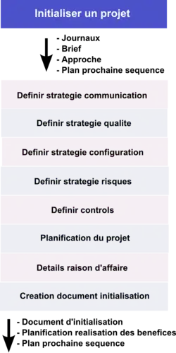 (IP) - Initialiser un projet (IP) est un processus clef, car c'est ici que la planification de l'ensemble du projet, la justification de sa raison d'affaire, l'évaluation des bénéfices attendus, l'approche qualité, etc. sont décidés. Au cours de ce processus, un important document est produit : le document d'initialisation du projet, qui est un composite des points précédents. Ce document sera en permanence consulté et réévalué à l'issue de chaque séquence et servira, in fine, au conseil pour l'évaluation des réalisations et la conduite du projet. Formellement, initialiser un projet comprend huit activités : l'élaboration des quatre stratégies de gestion (qualité, risque, configuration et communication) et leur harmonisation avec celles préexistantes dans l'environnement du projet (programme/organisation hôte), l'élaboration détaillée de la raison d'affaire et de la revue des bénéfices, la mise en place des processus de contrôle, le détail de la planification de l'ensemble du projet et la construction du document d'initialisation qui consolide tous les précédents. Le document d'initialisation est, avec le plan pour la séquence suivante, le produit de sortie de ce processus.