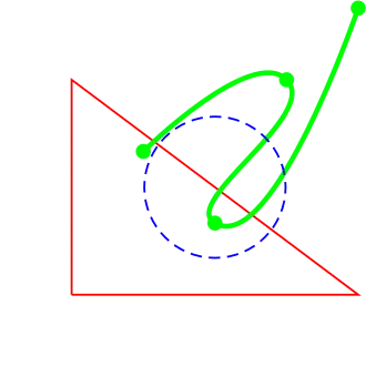 \pscurve[linecolor=green,linewidth=2pt,showpoints=true](5,5)(3,2)(4,4)(2,3)