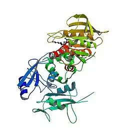 Il comporte deux domaines SH2[5]. Ces derniers bloquent l'activité phosphatase de la molécule s'ils sont libres. S'ils sont activés, ils libèrent le site phosphatase permettant son action enzymatique[6].