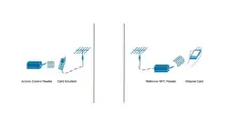 - Card Emulation mode : L'appareil (par exemple un smartphone) peut émuler une carte NFC sans adaptateur d'infrastructure de paiement. Les cartes et étiquettes ((en) : tags) sont techniquement proches, mais les cartes sans contact utilisées dans les paiements intègrent des technologies supplémentaires pour stocker des données sécurisées[47] ;