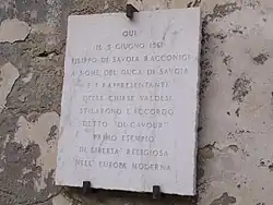 - ↑ (it) « Capitulationi et articoli ultimamente accordati tra l'Illustrissimo Signor Monsignore di Racconigi da parte di Sua Altezza et quelli delle valli di Piemonte chiamati valdesi. Testo dell'Accordo di Cavour (5 giugno 1561). Luoghi Storici Valdesi. Documenti. », sur Il Comitato per i Luoghi Storici valdesi (consulté le ).
