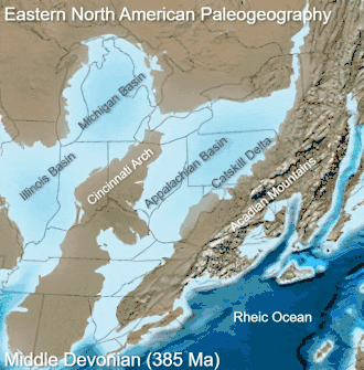 Reconstruction paléogéographique montrant la région du bassin des Appalaches pendant la période du Dévonien moyen.