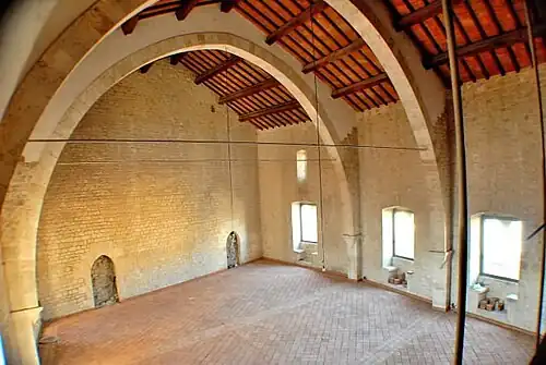 - ↑ Dur est le jugement de G. Fontana et A. Spalvieri, op. cit., pag. 10: "Questa serie di interventi, assolutamente scevri da qualsiasi interesse filologico, ha sconvolto interamente lo spazio interno del corpo di Fabbrica ed ha fornito al tetto una conformazione non rispondente un nessun canone storico e stilistico, addirittura evidenziando nella falda esposta ad ovest un quadrilatero di massicce cordonature in cemento".