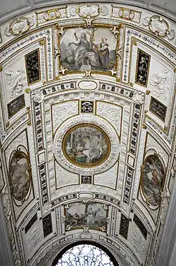 La peinture du XVIIe siècle au centre du plafond, San Giovanni baptisant la foule, dérive du tableau homonyme de Nicolas Poussin au Louvre. Selon les guides du XIXe siècle[Qui ?], il remplacerait un tableau attribué à Giorgione et représentant les Quatre éléments.