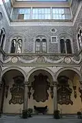 La cour ouverte à péristyle est également d'inspiration romaine, et les inginocchiati de finestre du rez-de-chaussée soutiennent les consoles sur la rue, encadrés dans des portiques aveugles semblables à la porte principale.