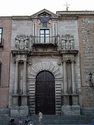 Les portails sont intéressants, dont le principal donnant sur la Plaza del Ayuntamiento. Les ailes le bordant sont composées de brique et de pierre, mais le centre est en pierre lisse avec un tympan triangulaire. Le petit balcon supérieur en fer est flanqué de nymphes sculptées tenant les armoiries du cardinal. Le tympan est orné de l'aigle double des Habsbourg, décoré dans le style maniériste avec des colonnes couplées[1].