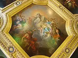 Quelques-unes des Salles ſont d'une belle proportion, boiſées & décorées avec goût : De ce nombre eſt le Parquet civil, & la première Chambre des Enquêtes. Les Plafonds de ces Salles ſont traités en Peinture : celui de la Chambre Criminelle a beaucoup de mérite. On remarquera dans les Salles que nous venons de noter, des Cheminées de marbre enrichies de Bas-reliefs, d'une touche fort eſtimable. »