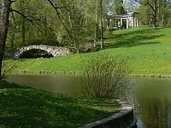 Depuis le palais, sur la rive opposée de la Slavianka, s'ouvre un panorama avec une cascade, un pont et la colonnade d'Apollon. Cette dernière, de forme circulaire, fut agrémentée d'une statue en bronze d'Apollon, mais, vers 1800, une tempête mutila l'édifice qu'on laissa en l'état avec une partie en arc de cercle préservée, le reste des colonnes jonchant le sol, et une nouvelle statue d'Apollon rajoutée en 1826.