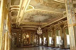 L'ornement rococo en or moulu prend la forme d'importantes dorures aux murs et au plafond. Celui-ci est d'une telle richesse qu'il a été comparé à l'Amalienburg de François de Cuvilliés au château de Nymphembourg[17]. Les murs et les portes sont ornés de miroirs, le plafond peint est doré et soutenu par des cariatides dorée[19].