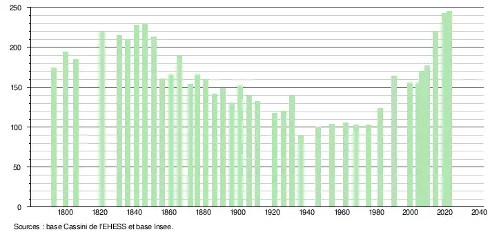 L'évolution du nombre d'habitants est connue à travers les recensements de la population effectués dans la commune depuis 1793. Pour les communes de moins de 10 000 habitants, une enquête de recensement portant sur toute la population est réalisée tous les cinq ans, les populations de référence des années intermédiaires étant quant à elles estimées par interpolation ou extrapolation[33]. Pour la commune, le premier recensement exhaustif entrant dans le cadre du nouveau dispositif a été réalisé en 2004[34].