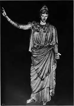 Apulée évoque un rêve dans les Métamorphoses[5], où il voit l'apparition de la déesse « Mère des dieux » portant une tunique par-dessus laquelle est un manteau (pallium) qui lui « éblouit les yeux ». Ce manteau est « d'un noir profond (...) passant sous le bras droit pour revenir sur l'épaule gauche, à la façon d'une toge, se déployant harmonieusement tandis que l’extrémité libre retombe en plis nombreux jusqu'en bas et se termine par des franges nouées. »[6].