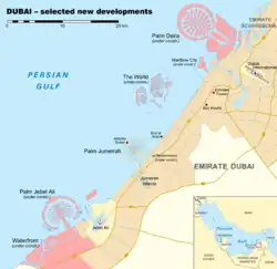 Image satellite des Palm Islands en 2014 avec de gauche à droite Palm Jebel Ali, Palm Jumeirah, The World (ne faisant pas partie du complexe de Palm Islands) et Palm Deira en construction. | ||