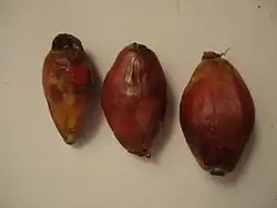 Le fruit est une drupe charnue, de forme ovoïde, sessile, d'environ 3 cm de long[3]. La pulpe ou mésocarpe, de couleur jaune-orangé, renferme près de 50 % de lipides qui constituent l'huile de palme. Les noix de palme sont groupées en régimes. Un régime pèse entre 5 et 50 kg et contient 500 à 4 000 drupes, selon l’âge du palmier, son origine, son environnement, etc.[4].
