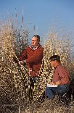 Calvin Vick (gauche) et John Massey mesurent la densité et la géométrie de touffes sauvages de Panicum virgatum (Little Topashaw Creek, Mississippi).