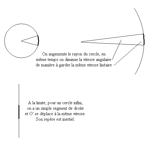 Pour celui qui trouverait absurde de faire tendre le cercle vers un cercle infini, il suffit de considérer uniquement la portion de trajectoire de O'. C'est un arc de cercle quasiment plat, pratiquement un segment de ligne droite.