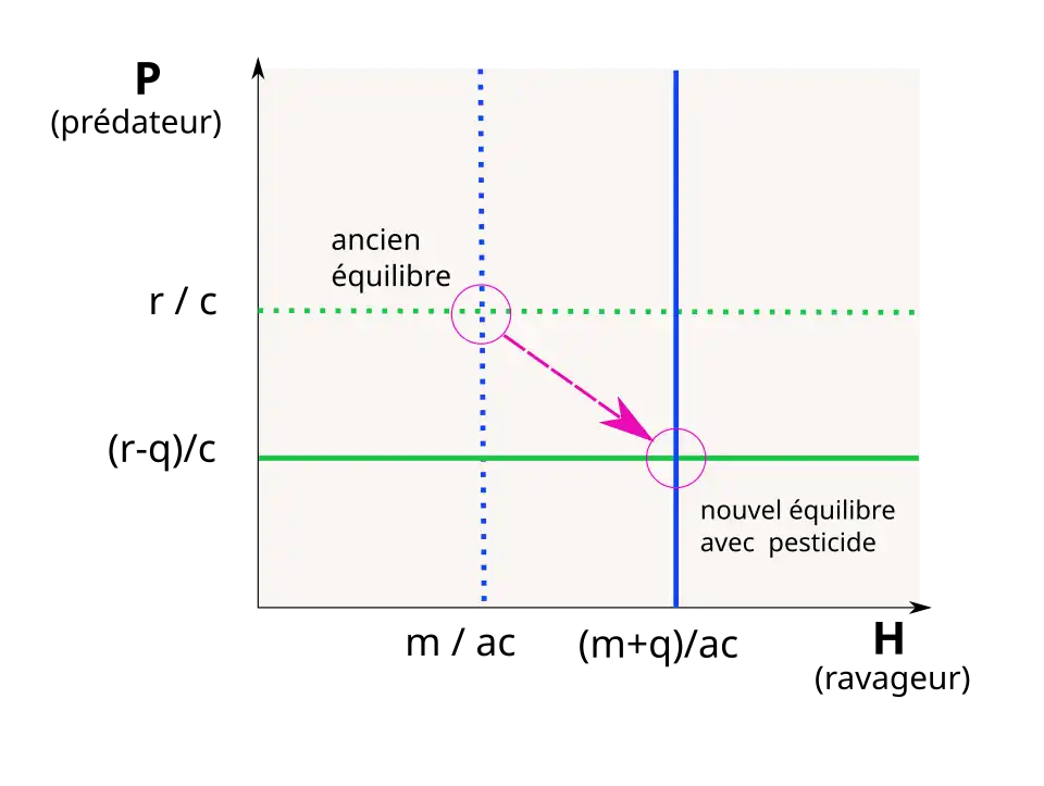 Comme on peut le voir avec les nouvelles isoclines, le nouvel équilibre aura une valeur de H supérieure et une valeur de P inférieure de sorte que le nombre de proies augmente alors que le nombre de prédateurs diminue. Ainsi les proies, normalement ciblées par le pesticide, ont au contraire été favorisées.