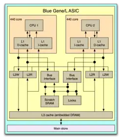 Le Blue Gene L dispose de seize cartes-nœuds (à gauche) pour un total de 440 cœurs organisés suivant le schéma de droite.