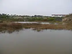- l'entre-deux-lacs est formé d'une digue séparant le lac nord du lac sud. Leurs eaux sont séparées afin de conserver le caractère saumâtre du lac sud et l'état salé de l'eau du lac nord ;