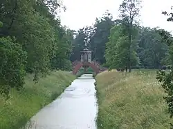 Ce petit pont cruciforme a été construit en 1779 au-dessus du canal. Il est agrémenté en son milieu d'une gloriette chinoise de brique laquée de couleur rouge framboise, jaune et bleue avec de hautes fenêtres vitrées. Le toit pointu est surmonté de boules formant une flèche dans le goût des chinoiseries. Quatre escaliers de vingt-trois marches forment un pont cruciforme.