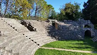 À environ trois cents mètres du théâtre, à l'extrémité orientale de la colonie, se trouve l'amphithéâtre, datant également du premier siècle après J.-C. Selon une reconstruction du XIXe siècle, le bâtiment avait naturellement un plan elliptique, avec le grand axe orienté est-ouest et long de 120 mètres, tandis que le plus court mesurait environ 105 mètres. Il y avait vraisemblablement douze portes d'accès, dont quatre donnaient directement dans l'arène, tandis que les huit autres donnaient accès au podium et aux gradins qui étaient divisés en trois ordres différents.