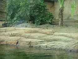 L'enceinte extérieure mesure 8x9m, dont 70% est une zone de piscine. Avec une profondeur maximale de 1 mètre, la piscine est aménagée avec des plantes pour fournir des zones abritées, des cachettes et des zones de repos au reptile. Les installations extérieures comprennent des radiateurs infrarouges, un coussin chauffant et une balance. L'eau de la piscine circule en continu à travers un système de filtration.