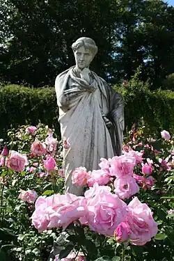 La Pensée entourée de la variété de rosier 'Rose de Rennes'.