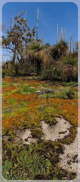 Parmi les espèces endémiques, on note[4]: Eucalyptus diversicolor (localement appelé karri), Eucalyptus jacksonii (dont les plus hauts mesurent jusqu'à 75m), Agonis flexuosa, Eucalyptus marginata (jusqu'à 40m), Corymbia ficifolia, Banksia grandis, Melaleuca cuticularis.