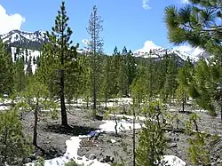 Au-dessus de 2 500 mètres d'altitude, les arbres se font rares et la végétation prend une forme subalpine. Les espèces d'arbres qui vivent à ces hauteurs sont le Pin à écorce blanche (Pinus albicaulis) et la Pruche subalpine. Ces arbres sont dénommés krummholz (littéralement « bois tordu ») car ils ont des formes tourmentées causées par le poids de la neige et par les vents violents[20]. La végétation se compose également de petites plantes comme le Pinceau indien (Castilleja), le Lupin de Lyall (Lupinus lyallii), Phyllodoce breweri, Cassiope mertensiana, Nama lobbii et Monardella villosa[22],[20].