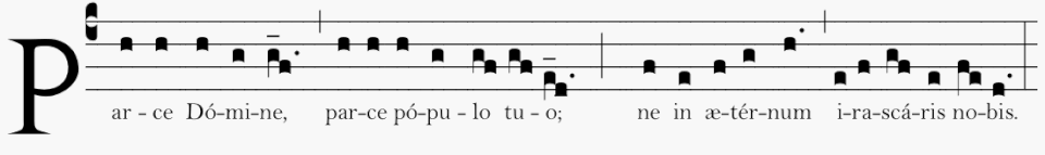 Le texte de l'antienne Parce Domine cite Joël 2:17. Les premiers sacramentaires témoignent d'une variété d'oraisons inspirées par cette citation du prophète Joël[1], les différentes variantes ayant en commun de commencer par la formule itérative Parce, domine, parce..[2].