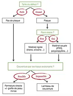 Dans le cas des ostéoradionécroses, la stabilisation pariétale n'est souvent pas nécessaire en raison de la raideur fibreuse des tissus environnants[15],[12]. La priorité est à l'apport de tissu bien vascularisé, par un lambeau, afin de permettre la cicatrisation[15],[18].