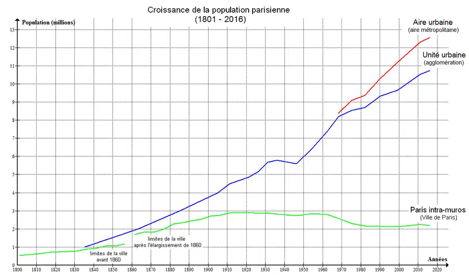 Son unité urbaine s'étend sur 2 853,5 km2[b 3] et rassemble 10 858 852 habitants[b 4], répartis dans 411 communes d'Île-de-France[b 5].