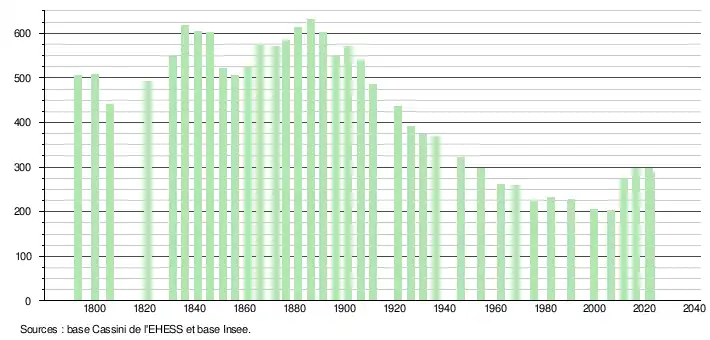 L'évolution du nombre d'habitants est connue à travers les recensements de la population effectués dans la commune depuis 1793. Pour les communes de moins de 10 000 habitants, une enquête de recensement portant sur toute la population est réalisée tous les cinq ans, les populations de référence des années intermédiaires étant quant à elles estimées par interpolation ou extrapolation[14]. Pour la commune, le premier recensement exhaustif entrant dans le cadre du nouveau dispositif a été réalisé en 2006[15].
