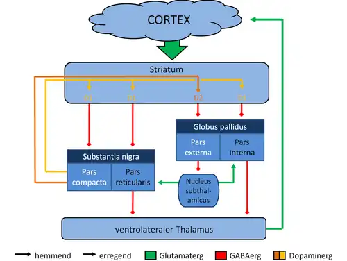 Cette boucle motrice serait notamment constituée d'une voie directe, comprenant le putamen et ses projections GABAergiques sur les parties motrices du GPi et de la SNr ; ainsi que d'une voie indirecte comprenant le putamen et ses projections GABAergiques médiées par les sorties des ganglions de la base de manière indirecte, c'est-à-dire au travers d'une séquence de connexions impliquant le GPe et le STN. Dans ce cadre, une augmentation de l'activité de la voie indirecte est susceptible de mener à une hypokinésie, voire à une akinésie totale, par augmentation de l'inhibition pallidothalamique. Des études menées sur le singe lésés par injection de MPTP (une neurotoxine détruisant spécifiquement les neurones dopaminergiques de la SN[24]) affichent que ceux-ci ont une activité neuronale tonique troublées dans les deux sections du globus pallidus[25]. On observe chez eux une augmentation de l'activité neurale tonique au sein du GPi, tandis que dans le GPe les décharges toniques diminuent. Cette fluctuation de l'activité tonique représenterait une baisse de la sélectivité des informations au sein du circuit[24]. De plus, après injection, on observe également qu'au sein du GPi plus de neurones ont une activité neuronale phasique pour les mouvements volontaires ainsi que pour les stimulations proprioceptives[26].