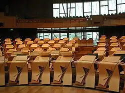 La chambre des débats du Parlement écossais dispose de sièges installés de manière à former un hémicycle, ce qui reflète le désir d'encourager les consensus entre les membres élus[24]. La chambre comporte 131 sièges, dont 129 sont occupés par les membres du Parlement, et les deux autres par les Scottish Law Officers - le Lord Advocate et l'Avocat général pour l'Écosse, qui ne sont pas des membres élus du Parlement mais dépendent du gouvernement écossais. Ces Law Officers peuvent s'exprimer de la même manière que les autres membres durant les débats, mais, n'étant pas élus par le peuple, n'ont pas le droit de voter. Les membres peuvent s'asseoir où bon leur semble dans la chambre, mais se regroupent généralement par partis politiques[24]. Le Premier Ministre, les ministres et les Law Officers sont assis au premier rang, dans la partie centrale de l'hémicycle, avec les partis opposés de chaque côté[24]. Le Presiding Officer, les clercs parlementaires et les autres officiels sont assis en face de l'hémicycle.