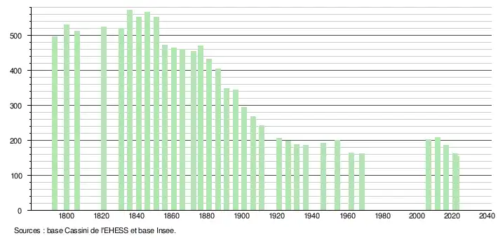 L'évolution du nombre d'habitants est connue à travers les recensements de la population effectués dans la commune depuis 1793. Pour les communes de moins de 10 000 habitants, une enquête de recensement portant sur toute la population est réalisée tous les cinq ans, les populations de référence des années intermédiaires étant quant à elles estimées par interpolation ou extrapolation[15]. Pour la commune, le premier recensement exhaustif entrant dans le cadre du nouveau dispositif a été réalisé en 2006[16].