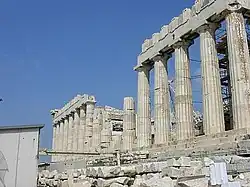 Le Parthénon est un bâtiment dorique périptère octostyle, avec des traits architecturaux ioniques. Il abritait la statue chryséléphantine d'Athéna Parthénos sculptée par Phidias et consacrée en -439/-438.