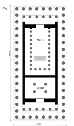 Le sékos (partie fermée de l'édifice) est surélevé de deux degrés. Il est amphiprostyle, c'est-à-dire que sa colonnade est limitée aux petits côtés, et hexastyle (6 colonnes ioniques[N 5] plus hautes et plus étroites d'un tiers que les colonnes doriques)[28]. Sa nef centrale a une portée de onze mètres, encore jamais atteinte à l'époque ; ses étroites nefs latérales sont éclairées par deux fenêtres (9,75 × 4,20 m) de part et d’autre de la porte d’entrée, qui éclaire l’espace central. Le naos, large de 9,815 m, est entouré d'une colonnade faisant un retour derrière la statue[24].