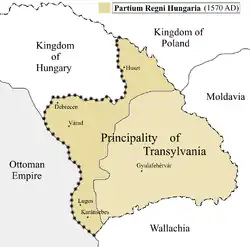 - à l'est la Principauté de Transylvanie : les historiens hongrois nomment royaume de Hongrie orientale cette principauté élargie au Partium, c'est-à-dire aux parties du royaume hongrois rattachées à elle. La limite entre le Partium et la Transylvanie d'avant son élargissement se situe au Pasul Craiului (de) (hongrois : Király-hágó), considéré par les Hongrois comme la « porte de Transylvanie » (Erdély kapuja), col de 582 mètres d'altitude situé à Bucea aujourd'hui en Roumanie.