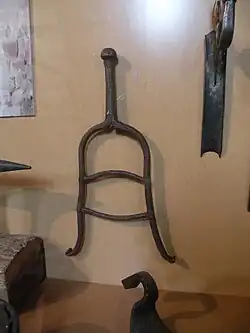 - pas-d’âne : appareil métallique qui permet de conserver la bouche de l'équidé ouverte pendant les soins vétérinaires. C’est un instrument qui est constitué d’une armature de fer sur laquelle sont placés deux plateaux circulaires percés en leur centre.