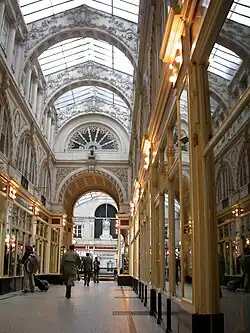 - au-dessus de la galerie Santeuil, le choix a été fait de disposer une verrière partielle (disposant du même système d'aération que celle de la galerie de la Fosse), d'une portée de 4,60 m, entrecoupée par des arcs de pierre, dits « doubleaux », espacés d'environ 3,50 m[31], qui forment une liaison entre les façades latérales du passage, et qui sont abondamment ornés[32] ;