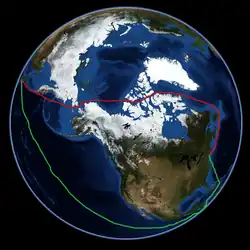 L'avantage du passage du Nord-Ouest : New York-Tokyo par le canal de Panama, 18 200 kilomètres, par le passage du Nord-Ouest 14 000 kilomètres. Le trajet dessiné en rouge représente l'option nord avec un passage au nord-est de l'île de Baffin, et au nord de l'île Somerset et de l'île Victoria.