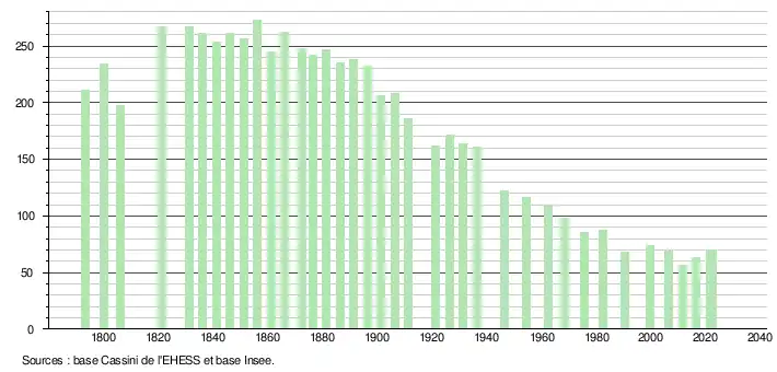L'évolution du nombre d'habitants est connue à travers les recensements de la population effectués dans la commune depuis 1793. Pour les communes de moins de 10 000 habitants, une enquête de recensement portant sur toute la population est réalisée tous les cinq ans, les populations de référence des années intermédiaires étant quant à elles estimées par interpolation ou extrapolation[14]. Pour la commune, le premier recensement exhaustif entrant dans le cadre du nouveau dispositif a été réalisé en 2006[15].