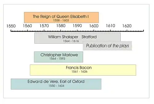 Selon l'étude de Dean Keith Simonton, « il ne fait pas l'ombre d'un doute » que la chronologie communément admise des pièces de Shakespeare est dans l'ensemble correcte, et que les œuvres du dramaturge présentent un développement stylistique cohérent avec celui d'autres génies littéraires[115]. En examinant les thèmes des pièces de Shakespeare d'une part et le contexte politique de l'époque d'autre part, Simonton constate des relations claires entre les deux, avec deux années de décalage, ce qui n'est pas le cas des chronologies alternatives proposées par les partisans du comte d'Oxford[116]. Simonton, lui-même sympathisant oxfordien, indique qu'il s'attendait à ce que son analyse soutienne la théorie oxfordienne, et conclut que « [s]es attentes ont été détrompées[117] ».