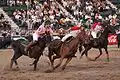 La circonférence est l'élément caractéristique du canard, et c'est excitant. Deux cavaliers montent à toute vitesse, chacun prenant le canard par une poignée; par des secousses propres, ils essaient de s'emparer du canard. Notez que celui qui "offre" fait toujours des sangles avec sa main droite; la main qui ne serre pas doit tenir les rênes. Pendant le serrage, il est interdit de s'appuyer sur la chaise. Le canard nécessite un cheval entraîné et une grande agilité de la part du cavalier pour ramasser, sangler, gifler et convertir.